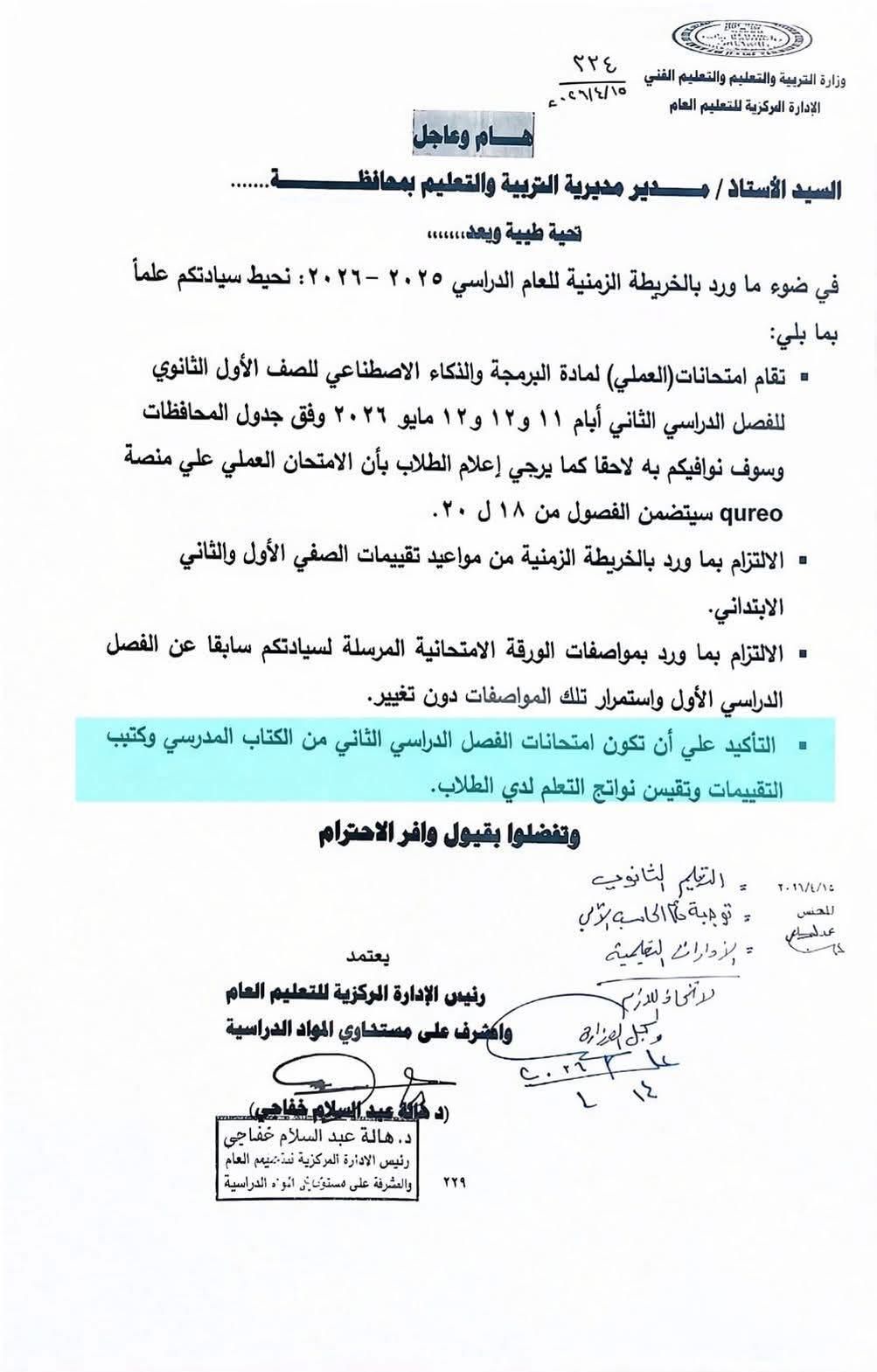 📌 التأكيد على أن تكون امتحانات الفصل الدراسي الثاني لجميع المواد